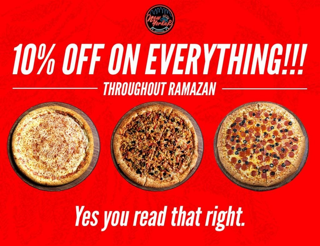 - New Yorker Pizza is giving 10% discount on everything in its menu.