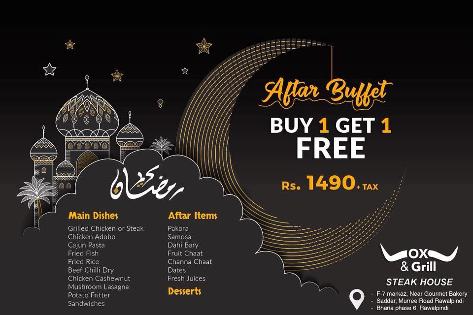 - OX and Grill diving you discount on two deals. Buy one Iftar buffet and get other free. Price of Iftar buffet is Rs. 1490+tax